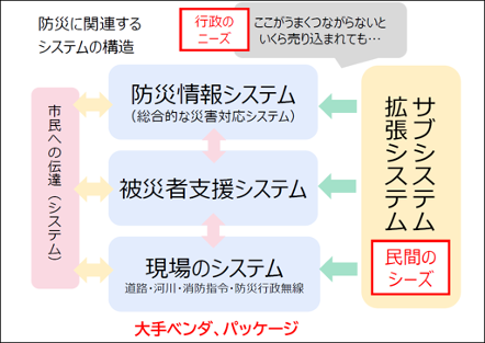 基本的な防災情報システム、被災者支援や現場のシステム(図の青色の部分)があって、これらのシステムはだいたい大手ベンダーさんのパッケージで作られています。それに市民に伝達していく部分(ピンク色の部分)の機能が加わってきています。これが基本形です。